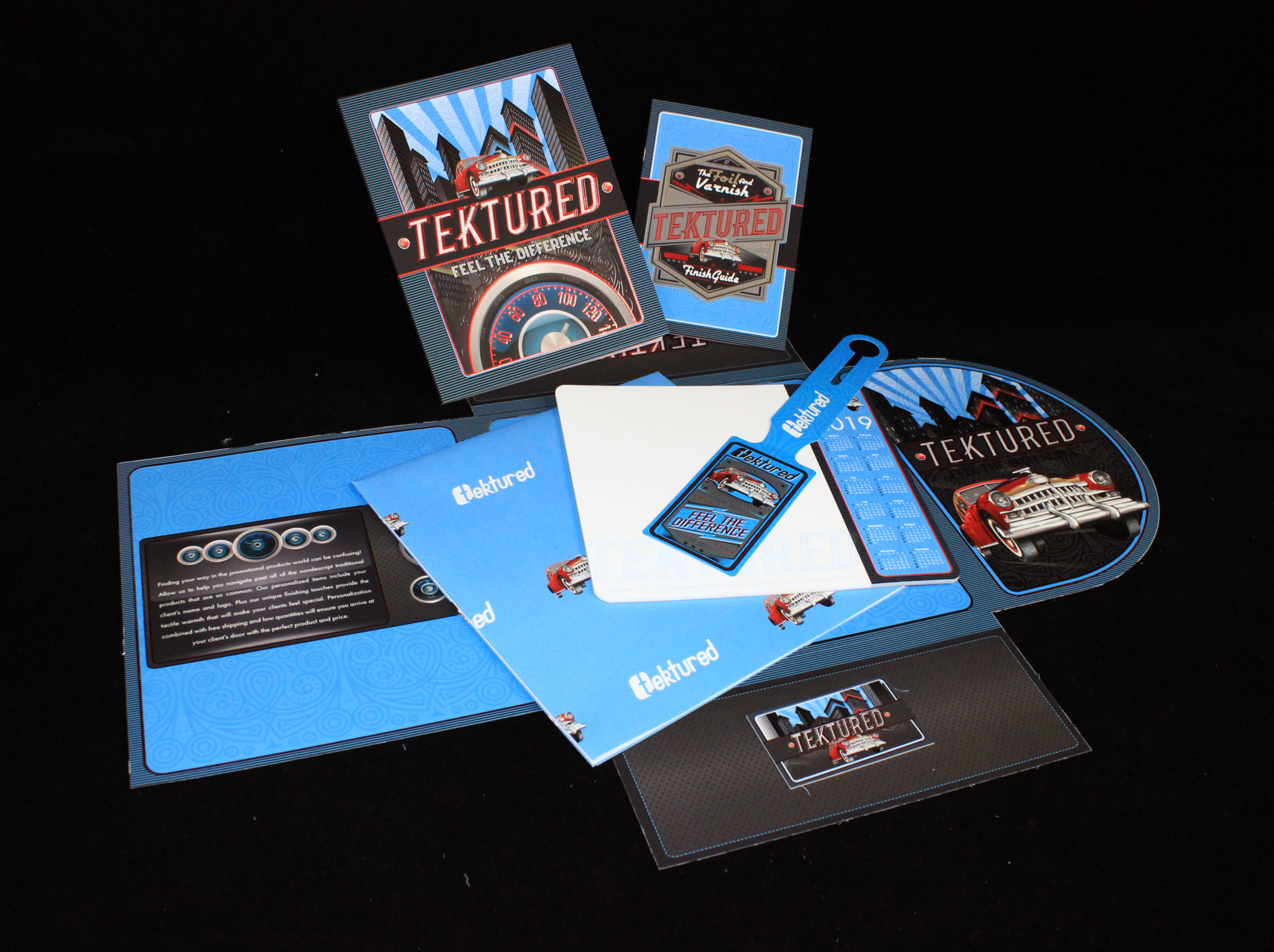 Our brand Tektured focuses on providing suppliers with branded promotional products to be passed on to clientele. The sample kit demonstrates many of Tektured’s capabilities for product types; i.e. notebooks, luggage tags, folders, and many more options.